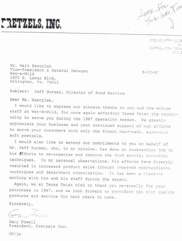 Jeff Nursey employed as Director of Food and Beverage overseeing the Arlington, Texas Park and the Garland, Texas Park. Key Management review : Walt Hawrylak the Vice president and General Manager of the Texas parks. Today is Thursday, November 30, 1989 and I am doing the annual review of Jeff Nurseys key management performance evaluation. Jeff was hired on November 19, 1986 and has been in this position for 3 years. Jeff has had an excellent three years as the Food and Beverage Director for the two Texas parks. In his tenure year after year several milestones were achieved: